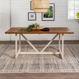 Embrace rustic design to create a cozy atmosphere with this attractive trestle dining table. The two-toned finish and distressed rectangular top provide a country-inspired vibe to grace your kitchen. The trestle-style frame will wow any guest that comes over for brunch or family dinners. Rest easy on the solid wood build, knowing it was responsibly harvested from renewable forests. Pair with the matching dining bench to accommodate the optimum number of guests in your new farmhouse haven.