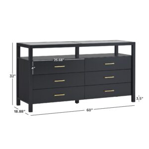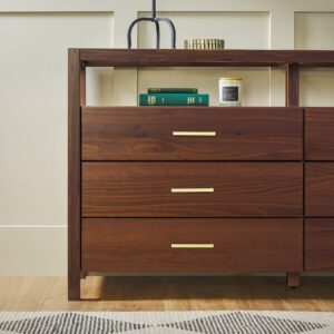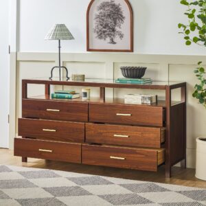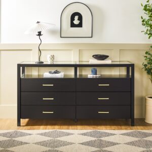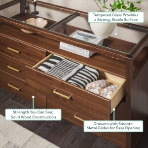 The Isla Solid Wood & Glass Shadow Box Dresser brings elevated style and smart storage to your space. With clean lines, solid wood construction, and a tempered glass top that holds up to 100 lbs, it blends modern elegance with everyday function. Six spacious drawers glide smoothly, giving you room to tuck away clothes, clutter, and more. The shadow box shelf creates the perfect spot for books, framed photos, or a little greenery. And with Walker Edison EZ Assembly™, the drawer assembly is 100% tool-free takes 60 minutes or less to build. A scratch-resistant surface and sturdy build mean it’s made to last. Plus, it meets ASTM F2057 safety standards and includes a wall anchor kit for extra peace of mind. Effortless to assemble, easy to style, and built for real life, this is the dresser that ties it all together—beautifully.