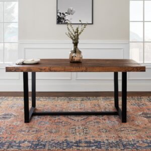 Reclaim a space where conversation is kindled and dinner is served with this modern farmhouse dining table. The plank-style top and distressed finish of the solid wood embrace a rustic aesthetic, while the black painted base lends a modern touch to the piece. Its contrasting and subtly contemporary design make it the perfect addition to the dining room or kitchen of your modern, rustic, or farmhouse-inspired space. Simple yet spacious, its solid pine wood build will encourage table talk between loved ones for countless dinners, game nights, and get-togethers with friends and family for years to come.