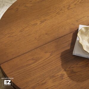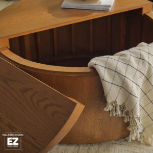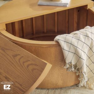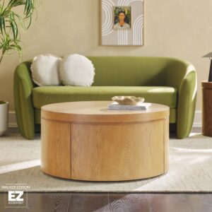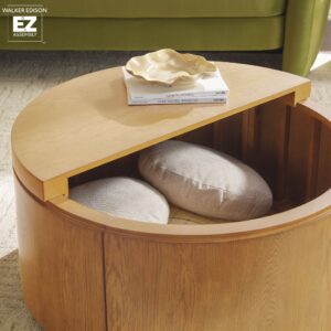 Designed to complement a range of aesthetics, this stunning coffee table brings modern contemporary style into any space. Its soft, sculptural shape and warm tones instantly elevates the room. The drum-style design isn’t just for looks — It’s a statement piece that’s as functional as it is striking. We want you to have the easiest assembly possible, and with Walker Edison EZ Assembly™, this comes together within 20 minutes or less, so you can spend less time building and more time styling. That removable top? It reveals hidden storage so you can keep your space feeling clean, calm, and pulled together — no matter what the day brings. Crafted with richly-grained solid oak wood veneer, it’s made to handle life effortlessly— cute seasonal décor? It’s the perfect spot. Plus, no more lost remotes thanks to a curated tray on the large table top.
