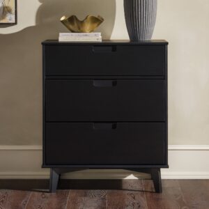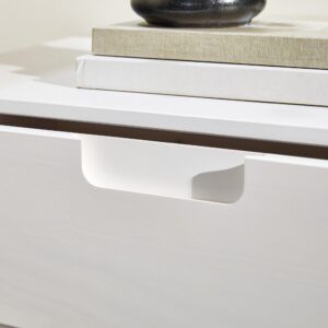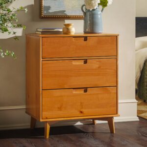 In a stylish, mid-century modern design featuring angled legs and cutout handles of solid pine wood in a stained finish. The intriguing design integrates a transitional aesthetic to complement your home décor.