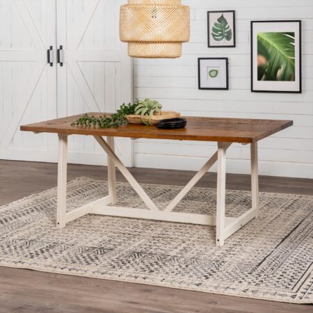 Embrace rustic design to create a cozy atmosphere with this attractive trestle dining table. The two-toned finish and distressed rectangular top provide a country-inspired vibe to grace your kitchen. The trestle-style frame will wow any guest that comes over for brunch or family dinners. Rest easy on the solid wood build, knowing it was responsibly […]